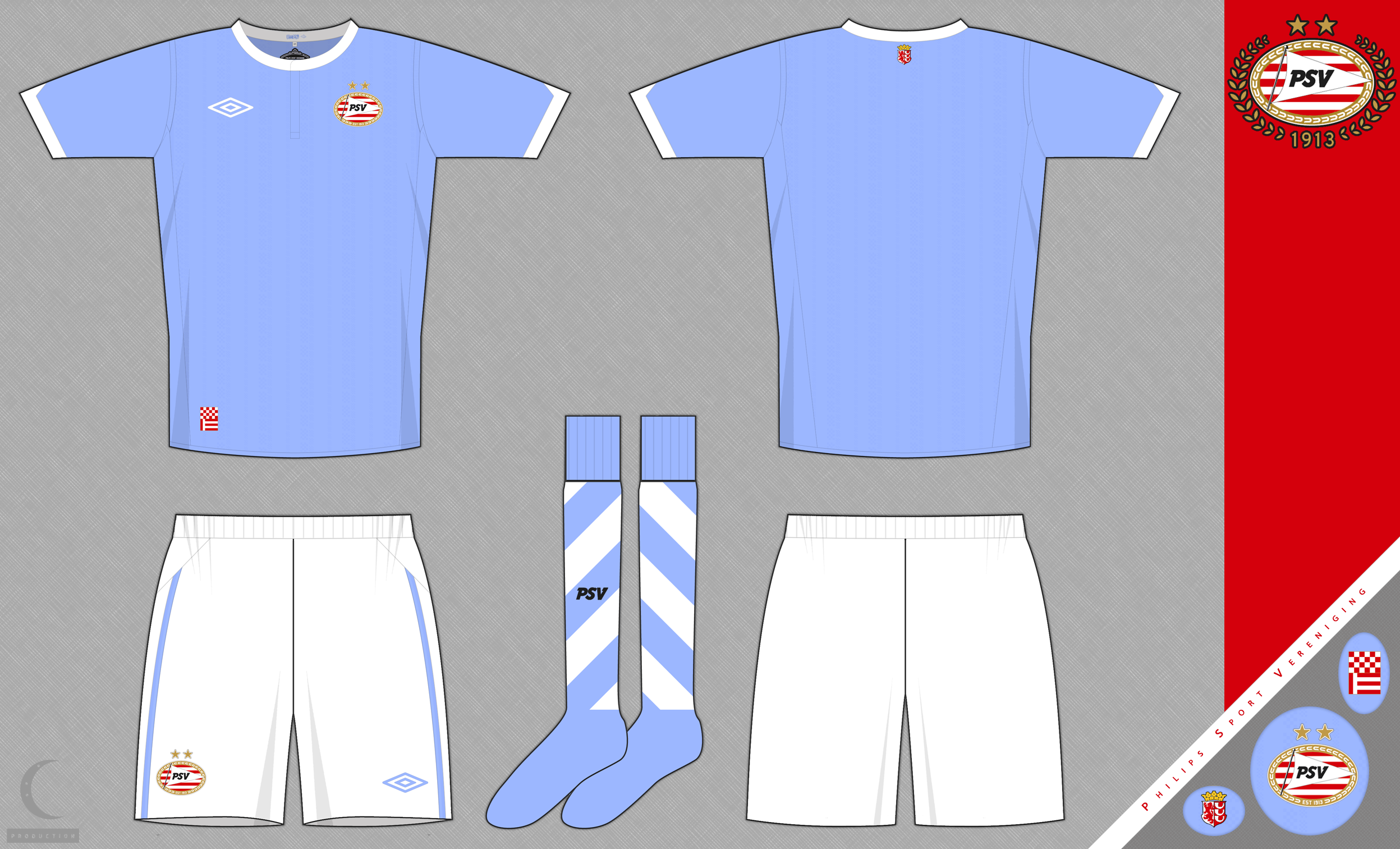 The shadow pattern on the shirt consists of hundreds of North Brabant flags. The Jock Tag consists of the flag of Eindhoven and the flag of North Brabant, the Eindhoven coat of arms is on the back of the shirt and the main gates of the Phillips Stadium is on the inside of the shirt.
