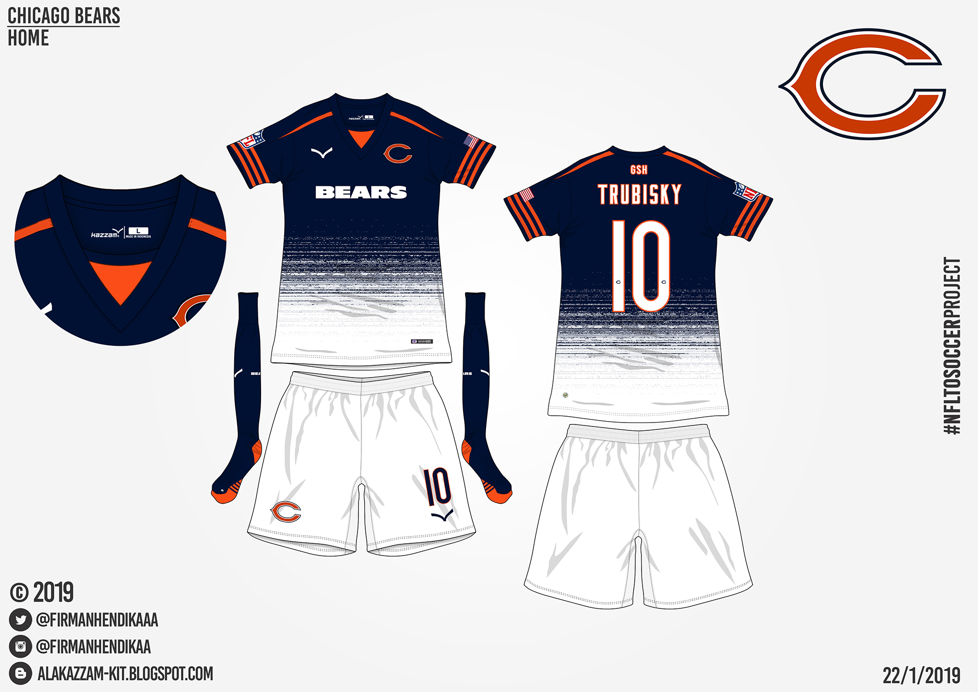 This kit uses navy blue as color based and white gradations. This kit uses a v-neck collar model inspired by Italian national team away kit in the 2016-2017 season. On sleeve I added three orange lines that inspired by the tradition of the Chicago Bears uniforms. Shorts uses white and socks use navy blue. Below the back collar is the inscription "GSH" which stands for the name of the founder of the Chicago Bears, George Stanley Halas.