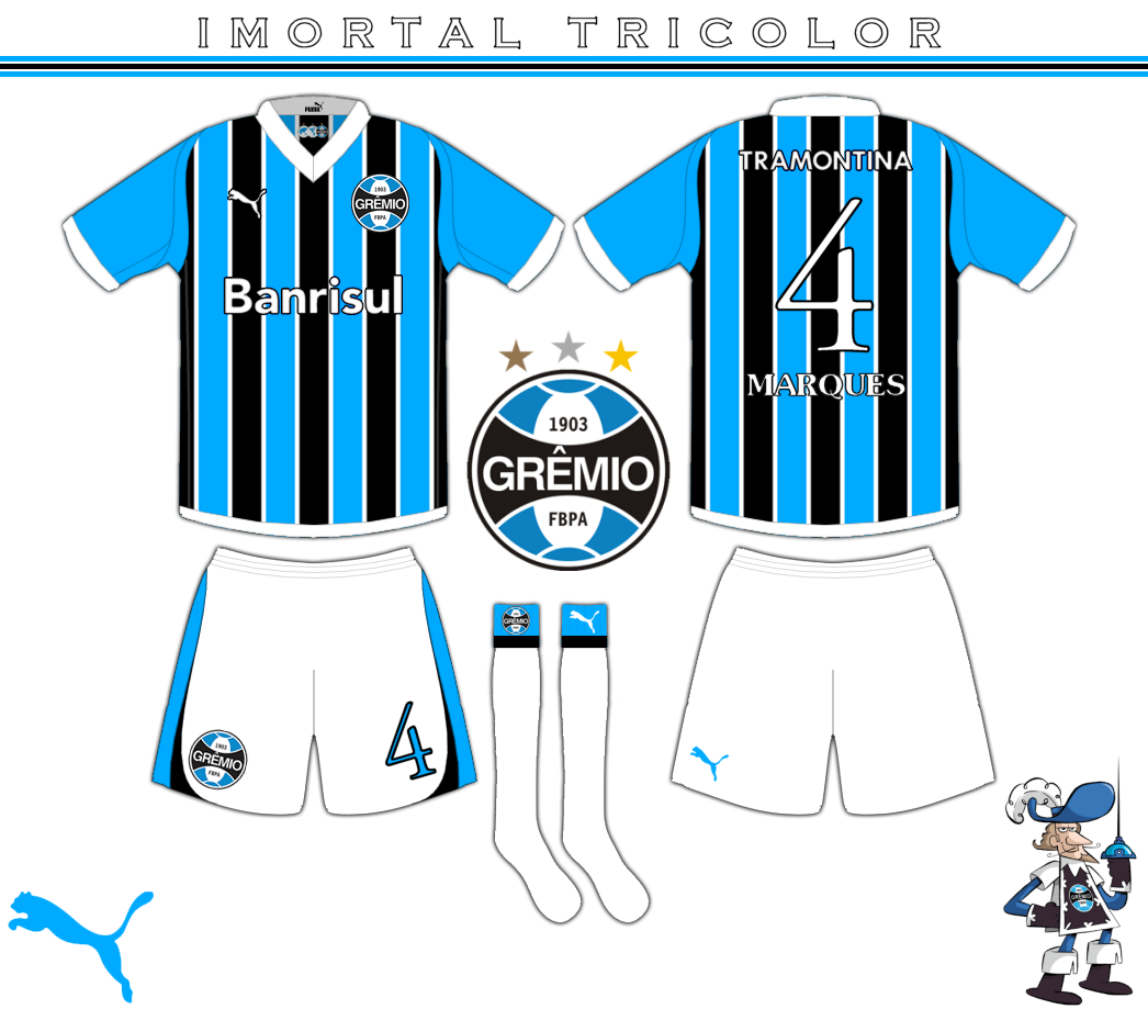 Home kit for Imortal Tricolor, this has all blue sleeves with a white cuff, a design that Gremio have never worn before, and on the inside of the collar is the Gremio \\\"Global\\\" crest