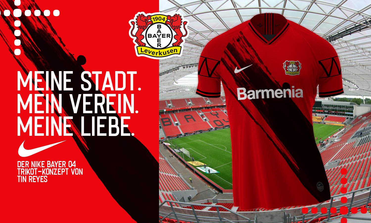 What if Nike signs a kit deal with Bayer Leverkusen? Well, I just thought about that, as if it popped in my mind. Technically just a basic kit, with arches inspired by the BayArena, and brush-stroked, maroon-black sash inspired by the latest Barcelona Senyera shirt. Typically basic, but overwhelming.