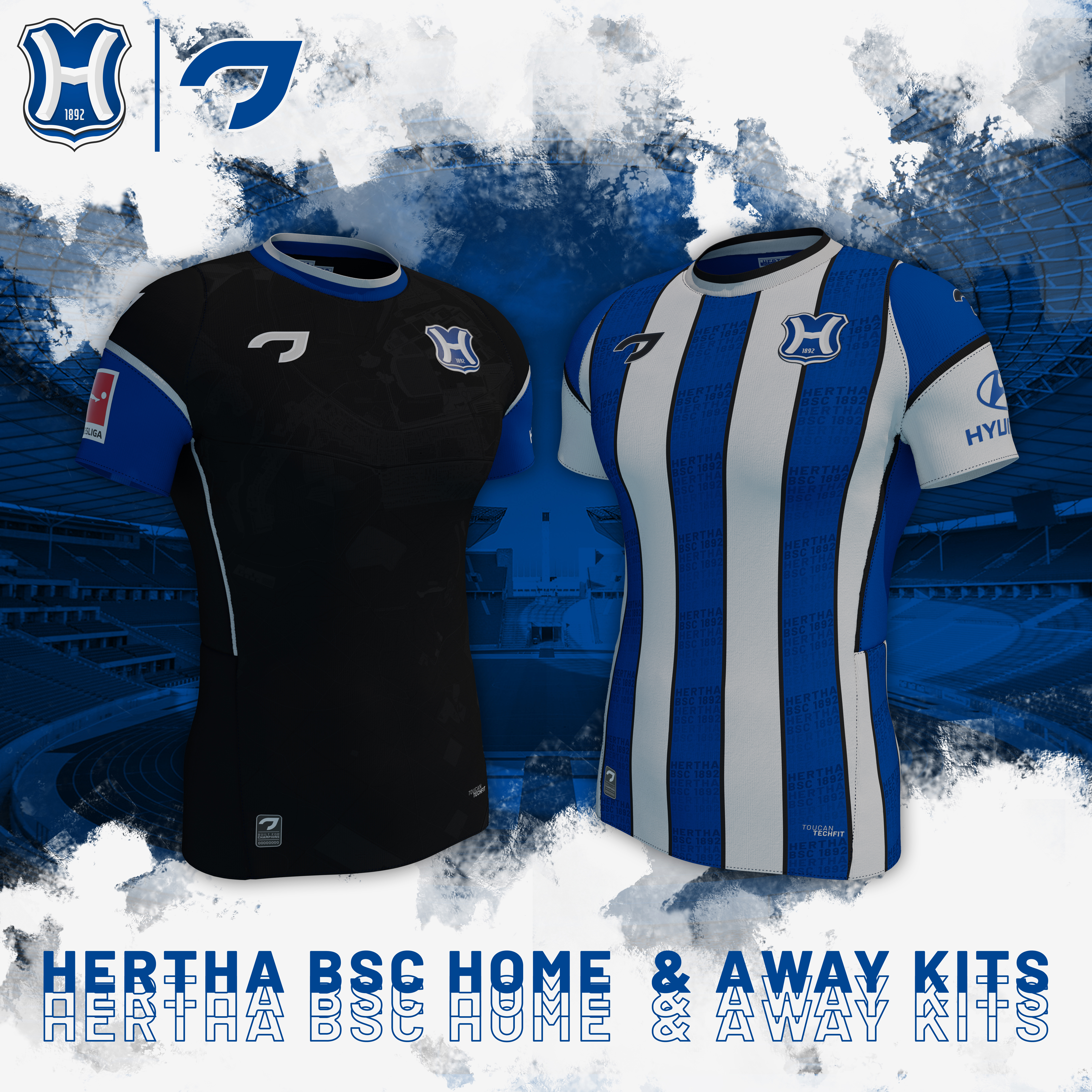 Just a couple of shirts I decided to create to pair with the crest I've designed for the Crest Redesign League. The home shirt features multiple "Hertha BSC 1892" inscriptions on the blue stripes, while the away one features a graphic of a map of the surrounding areas of Olympiastadion.