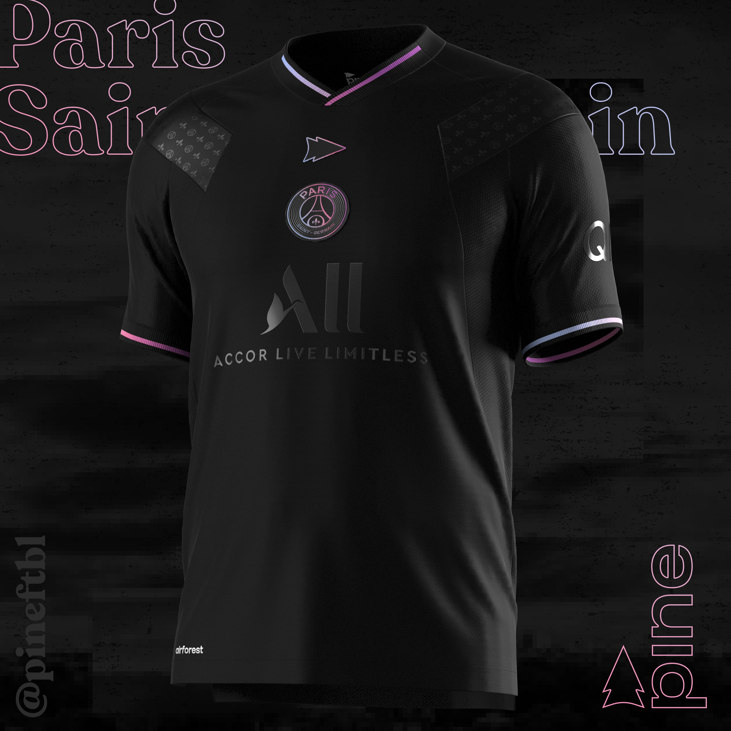 Third jersey design for PSG. Inspired by an old design I made, but adapted to a new personal template. The kit is completed with black shorts and socks.