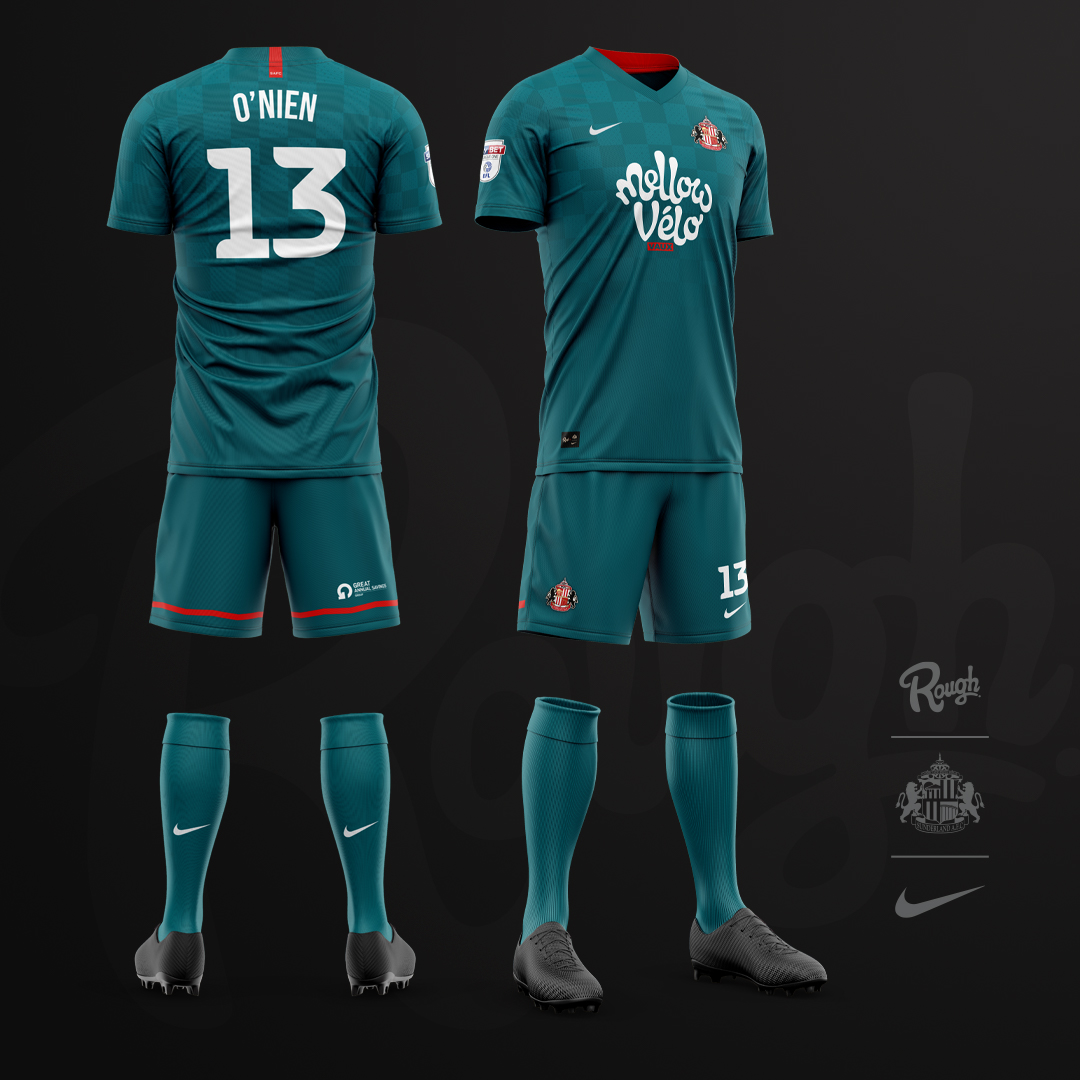 Concept for an away kit for AFC Sunderland. Dark Teal over a faded check with the Mellow Velo branded sponsorship from classic sponsor Vaux Brewery.