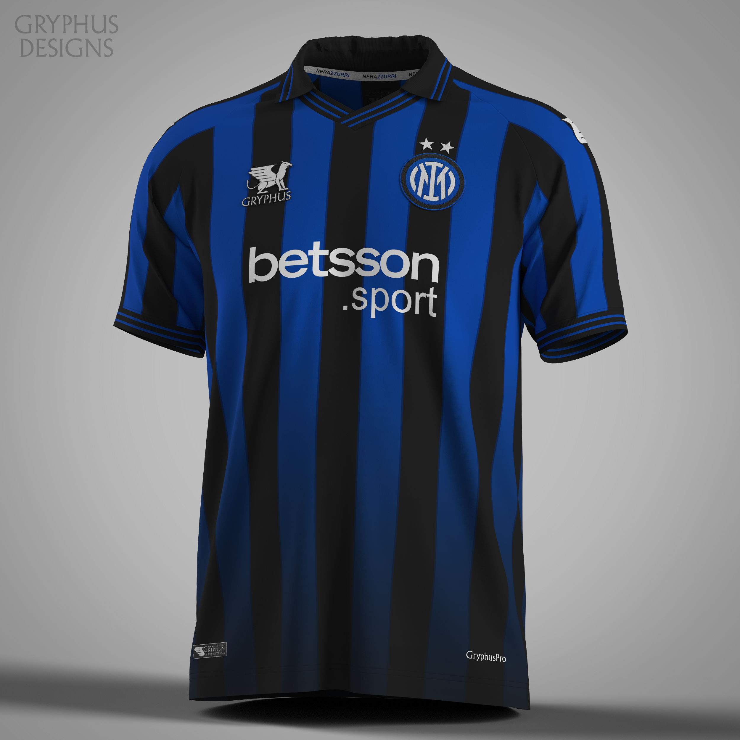 Classic black and blue Inter stripes complemented by navy pinstripes and a subtle black gradient at the bottom.