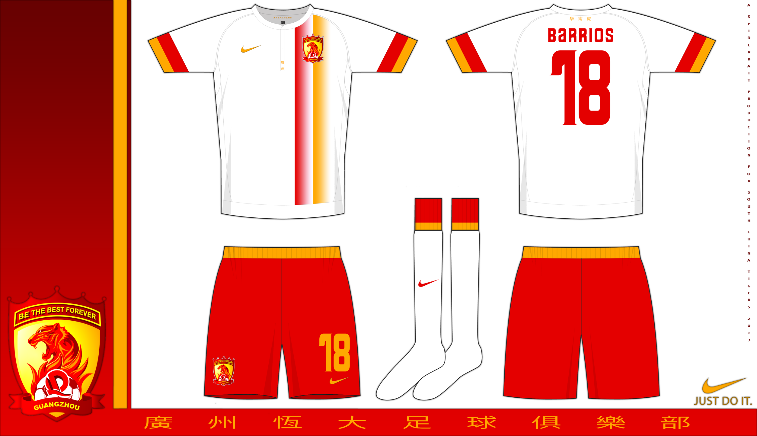 Home and change kits for the Chinese super league champions of 2012, the home is in red with gold pinstripes with gold collars, the change is in white with red and gold fade away stripes.