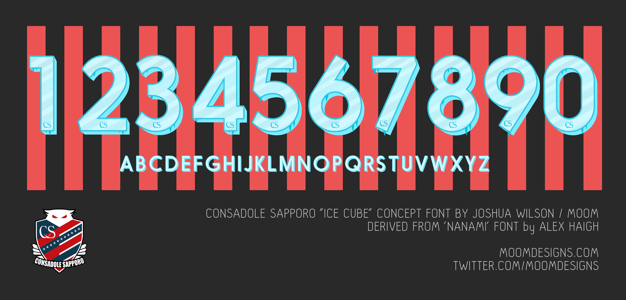Nanami font by Alex Haight used as the base. No intention to claim the base glyphs as my own! Please do not reproduce my ice-cube + icicle motif in a similar fashion tho. :(