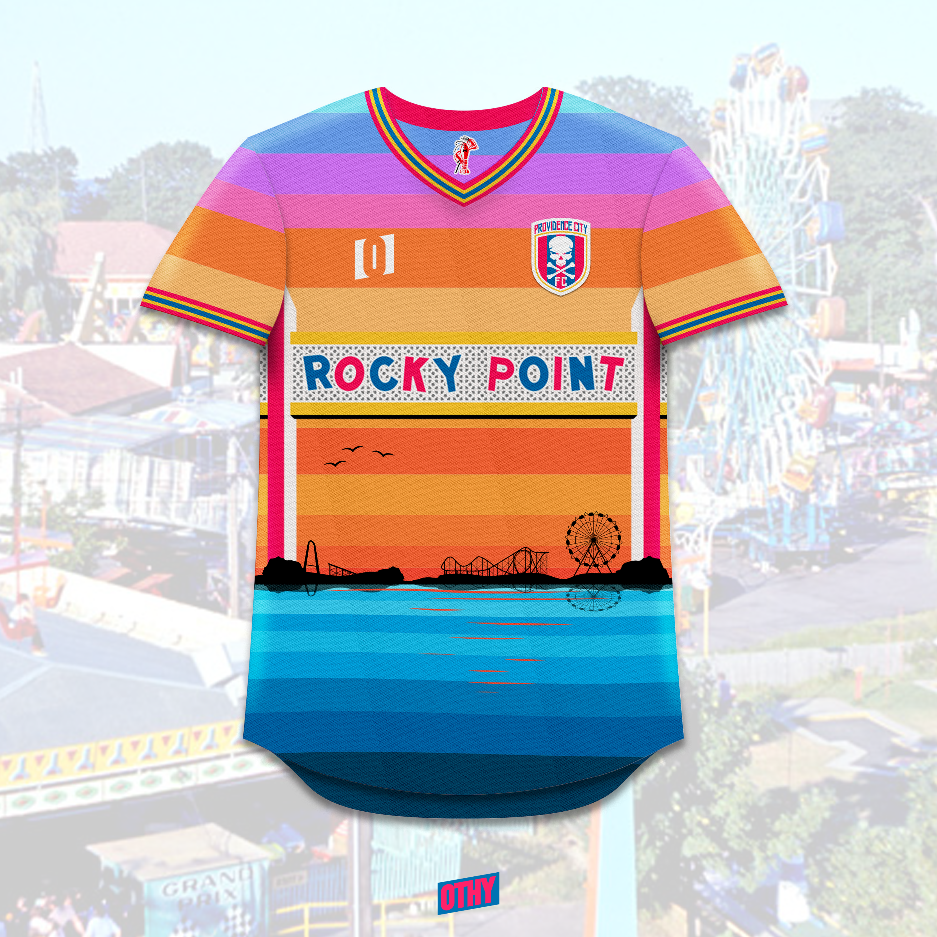 This kit is a mashup of Providence City FC and the defunct seaside Rocky Point Amusement Park. It features a sunrise over the bay, with the iconic entrance sign and some of the park's most popular attractions, as well as the park's lobster mascot "Rocky" on the inside collar. Rocky Point was a Rhode Island staple from 1847 until it closed in 1995.
