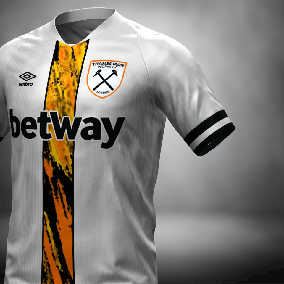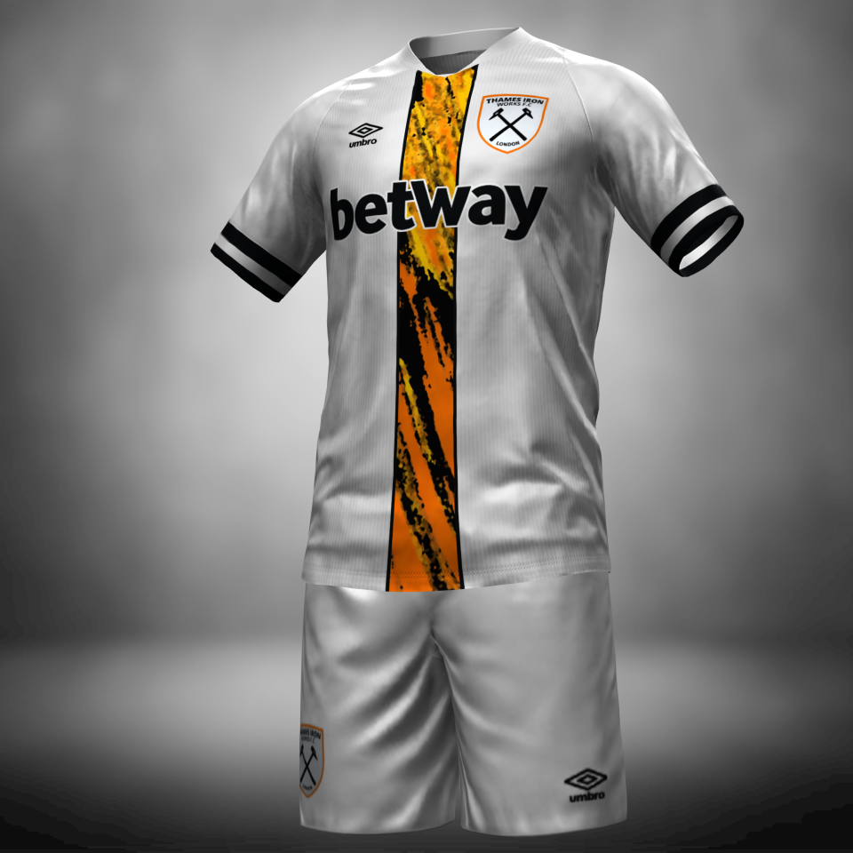 The Third kit is also based on The 2009/10 Away Kit made by Umbro but swaps the original colours once again for a modern silver and black design, with the firey orange stripe cutting through the middle representing the scorching flames of the Thames Iron Works furnace, this Kit also features an exclusive Thames Iron Works colour matched emblem. The shirt is paired with silver shorts and orange socks.